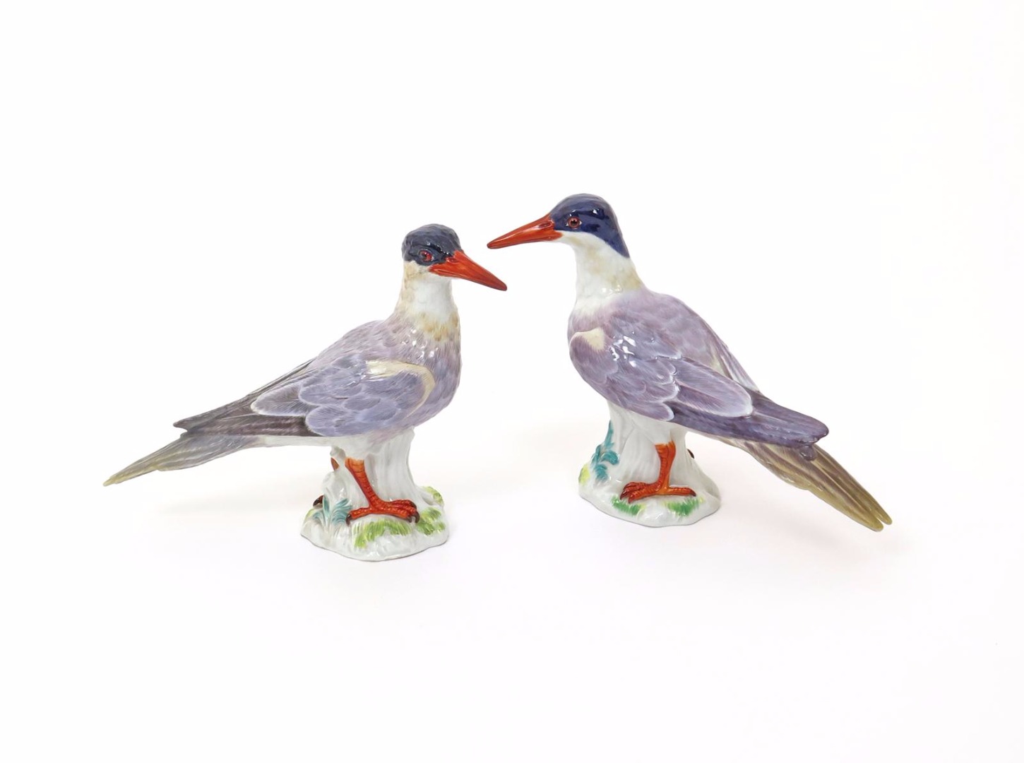 A pair of Meissen models of terns 20th century, each modelled standing on a grassy base with head slightly turned, naturalistically decorated with black caps and long orange beaks, blue crossed swords marks, some old restorations, 19.5cm high. (2)