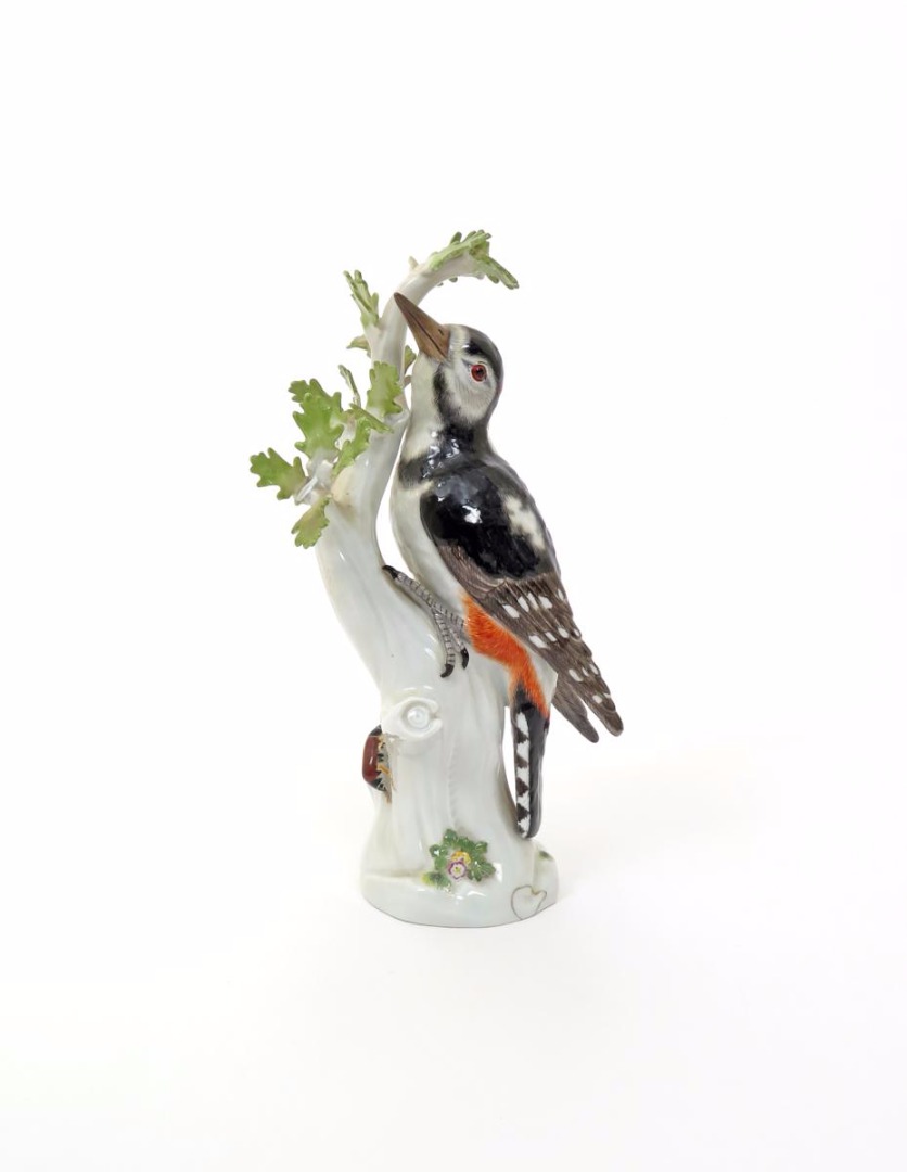 A Meissen model of a Greater Spotted Woodpecker modern, characteristically perched in the branches of an oak tree, with head turned slightly to sinister, wings folded, a stag beetle crawling the other side of the branch, blue crossed swords mark, minor damages, 26cm.