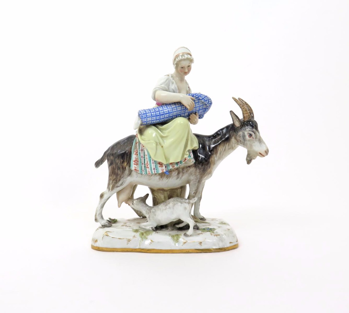 A Meissen figure of the Tailor's Wife 19th century, seated side-saddle on the back of a nanny goat at which a kid suckles, breast-feeding her own swaddled baby, blue crossed swords mark, restoration to the goat's horns and ears, 18cm high.
