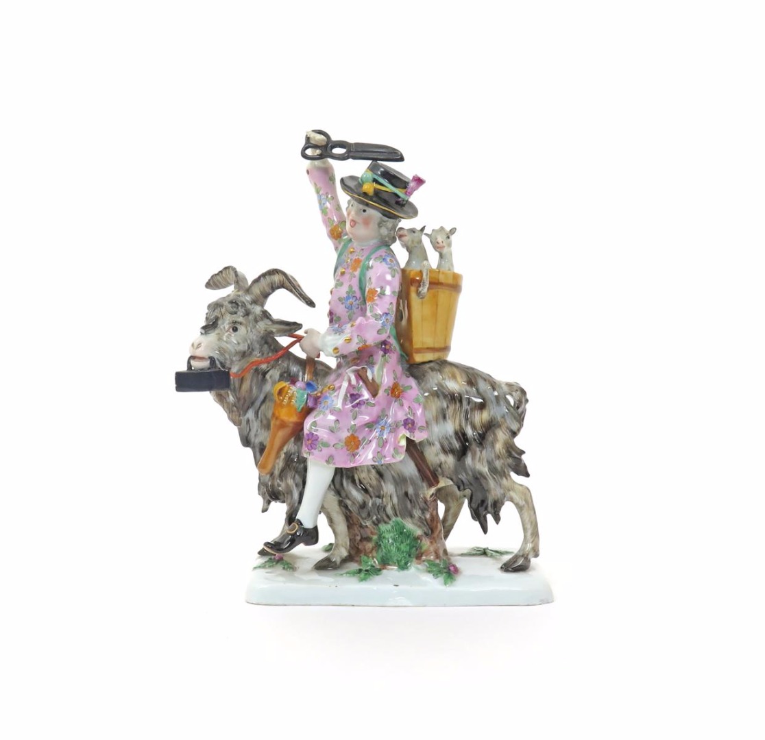 A Meissen figure of Count Brühl's Tailor 19th century, after the model by J J Kändler, the eccentric figure modelled astride a billy goat which holds a flat iron his mouth, the tailor brandishing a large pair of scissors above his head, two kids sitting in a half barrel strapped to his back, blue crossed swords mark, some restoration, 23.5cm high.