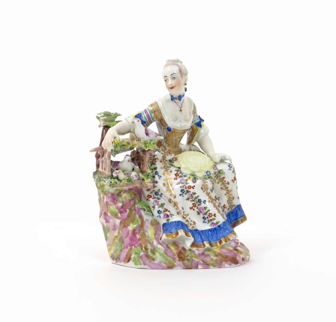 A Vienna figure of a lady late 18th century, seated beside a tree stump on which rests a dovecote containing a dove with four chicks, a further dove perched atop, blue shield mark, minor damages, 17cm.