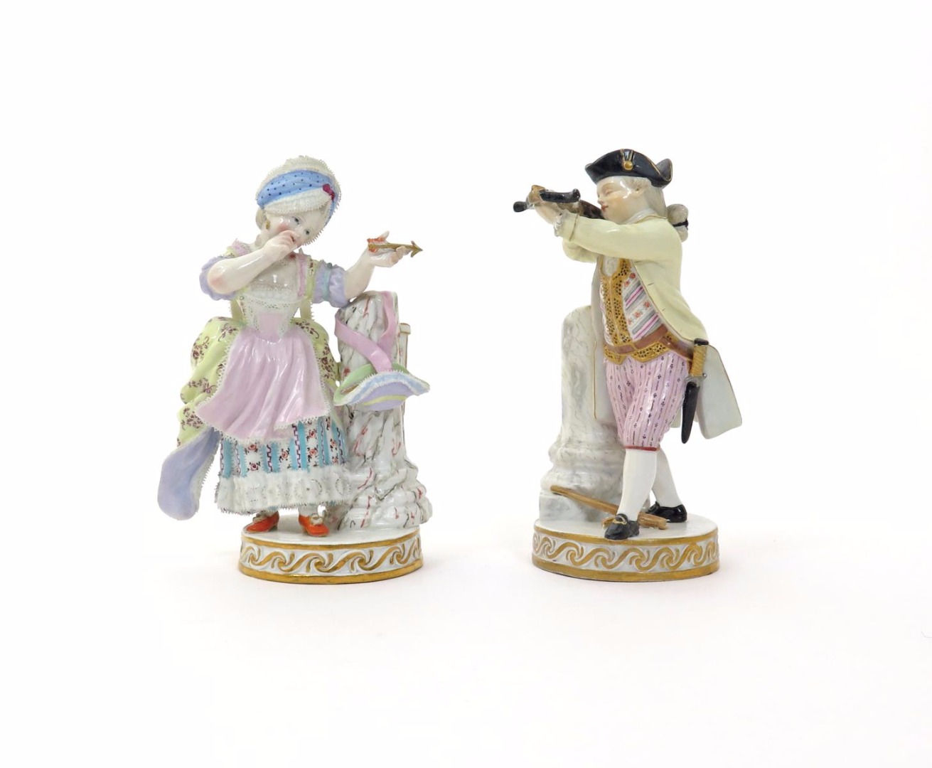 A pair of Meissen figures of a boy and girl firing arrows 19th century