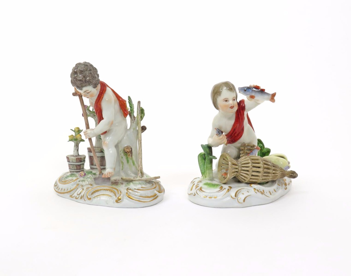 A near pair of Meissen figures of putti emblematic of the Elements 19th/20th century, after the models by J J Kändler, one representing Earth, digging with a spade, two potted rose bushes to one side, the other Water with a putto pulling fish from a basket, an upturned creel to one side, blue crossed swords marks, incised C98 and C100, a few small restorations, 12cm. (2)