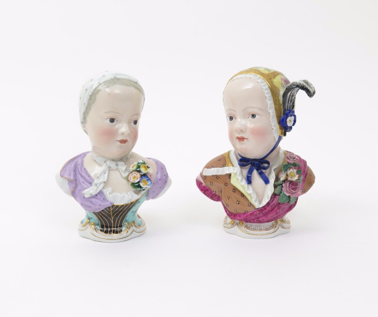 A pair of Meissen kinderkopf busts of the Bourbon children 19th century, after the models by Kändler, the prince wearing a gilt-edged bonnet with feather, tied with a blue ribbon, the princess a patterned white headscarf, each with a floral corsage, raised on quatrefoil bases, blue crossed swords marks, a little restoration to the prince, 15cm. (2)