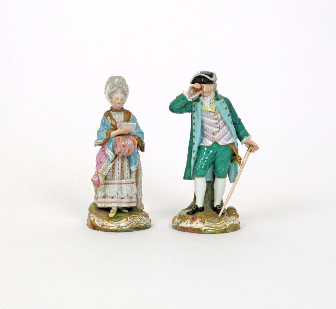 A pair of Meissen figures of the Racegoer and his companion 19th century, he dressed in a green suit, holding his spyglass to his right eye, his left holding the top of his cane, his companion holding a letter and with her other hand tucked into a bright feathered muff, blue crossed swords marks, incised D65 and D66, some restoration, 20.5cm. (2)