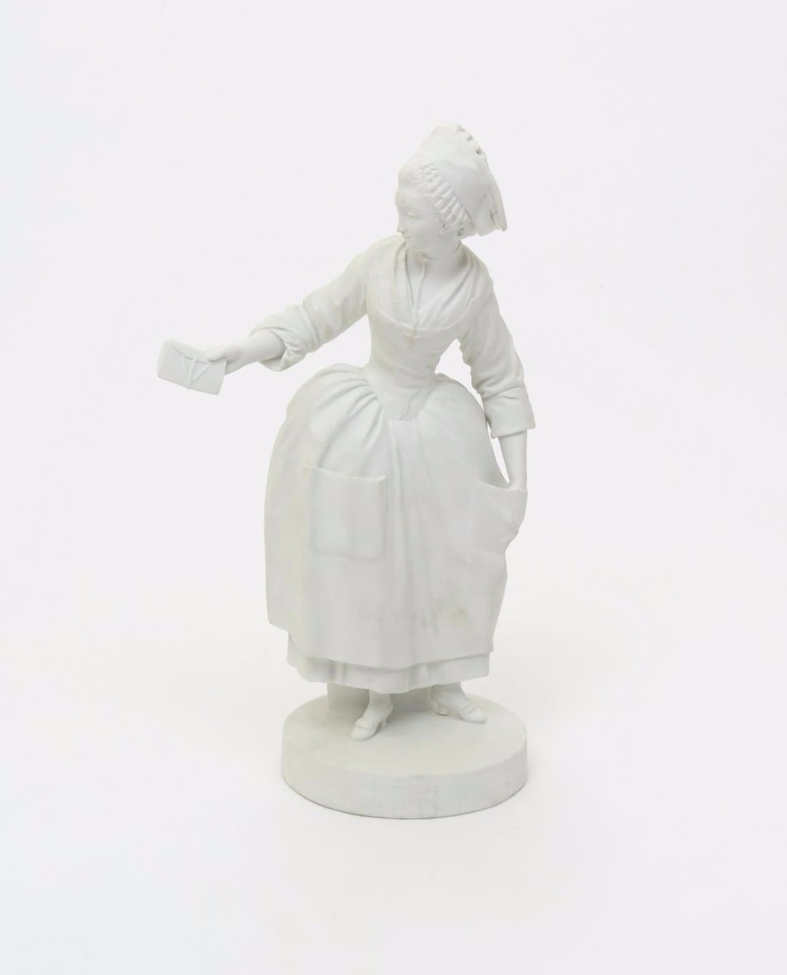 A Sèvres theatrical biscuit porcelain figure of Mademoiselle La Forrest c.1780, possibly modelled by Josse-François-Joseph Leriche, in her role as Jeanette, holding a letter in her right hand, her left tucked in the pocket of her apron, raised on a circular base, titled 'M'elle LAFOREST (l'ainé) role de Jeanette', incised marks to the base, 29cm.