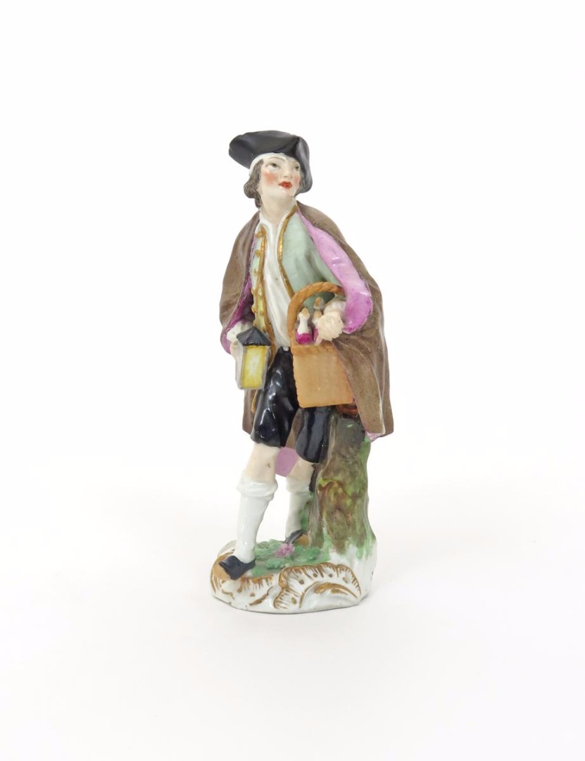 A Meissen figure of a Night Watchman c.1765, from the Cris de Paris series, modelled by P. Reinicke after a design by Christophe Hüet, carrying a lantern in one hand, a basket containing bottles slung over his left wrist, cancelled blue crossed swords mark to the back of the base, probably later-decorated, minor restorations, 13cm.