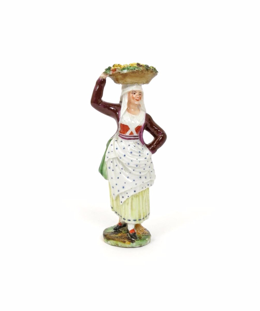 A Naples porcelain figure of a fruit seller c.1790, standing with a large basket of fruit balanced on her head and with one hand on her hip, raised on a low pad base, 14.6cm.