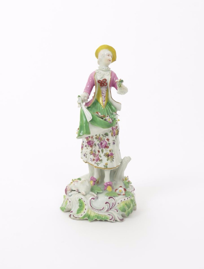 A Derby figure of a shepherdess c.1755-60, standing with a recumbent lamb at her feet, wearing a pink jacket over a yellow bodice and flower skirt, holding on corner of her green apron in her right hand, a small posy in her left, raised on a scrolled base applied with flowers and leaves, some restoration, 22.5cm.