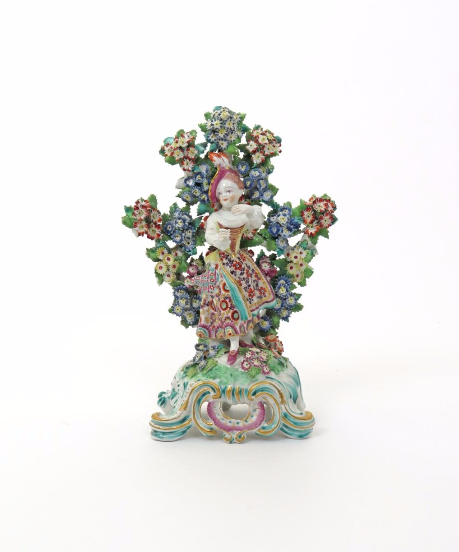 A good Bow figure of a female New Dancer c.1770, modelled in typical pose, raised on a tall scrolled and reticulated base highlighted in green, puce and gilt, standing before elaborate flowering bocage, 24cm.
