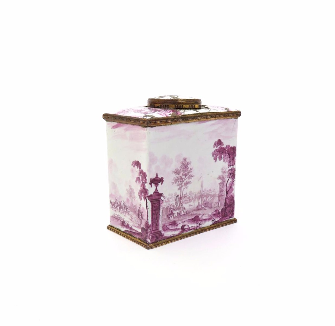 A South Staffordshire enamel tea canister and cover c.1770, the rectangular form finely painted in puce monochrome with a continuous landscape scene of figures fishing from boats in a harbour, tending cattle, and travelling on horseback with similar scenes echoed to the shoulders and cover, some losses to the top, 10cm. (2)