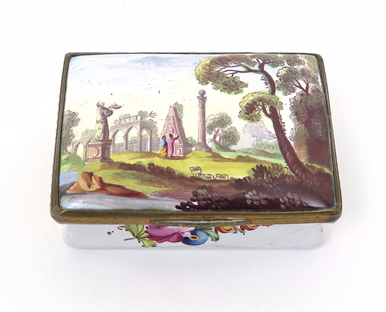 An English enamel snuff box 2nd half 18th century, of rectangular form, the top of the lid painted with two figures standing beside an obelisk among Classical ruins and trees, the sides and base with simple flower sprays on a white ground, fitted with metal mounts, 7.1cm.