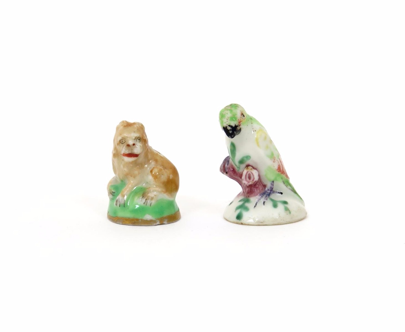 Two English porcelain fob seals c.1760-70, probably Chelsea, one formed as a parrot, brightly enamelled and perched on a low branch, the other modelled as a lion, recumbent on a grassy mound with head turned to sinister, the seals and metal fittings lacking, 2.5cm max. (2)