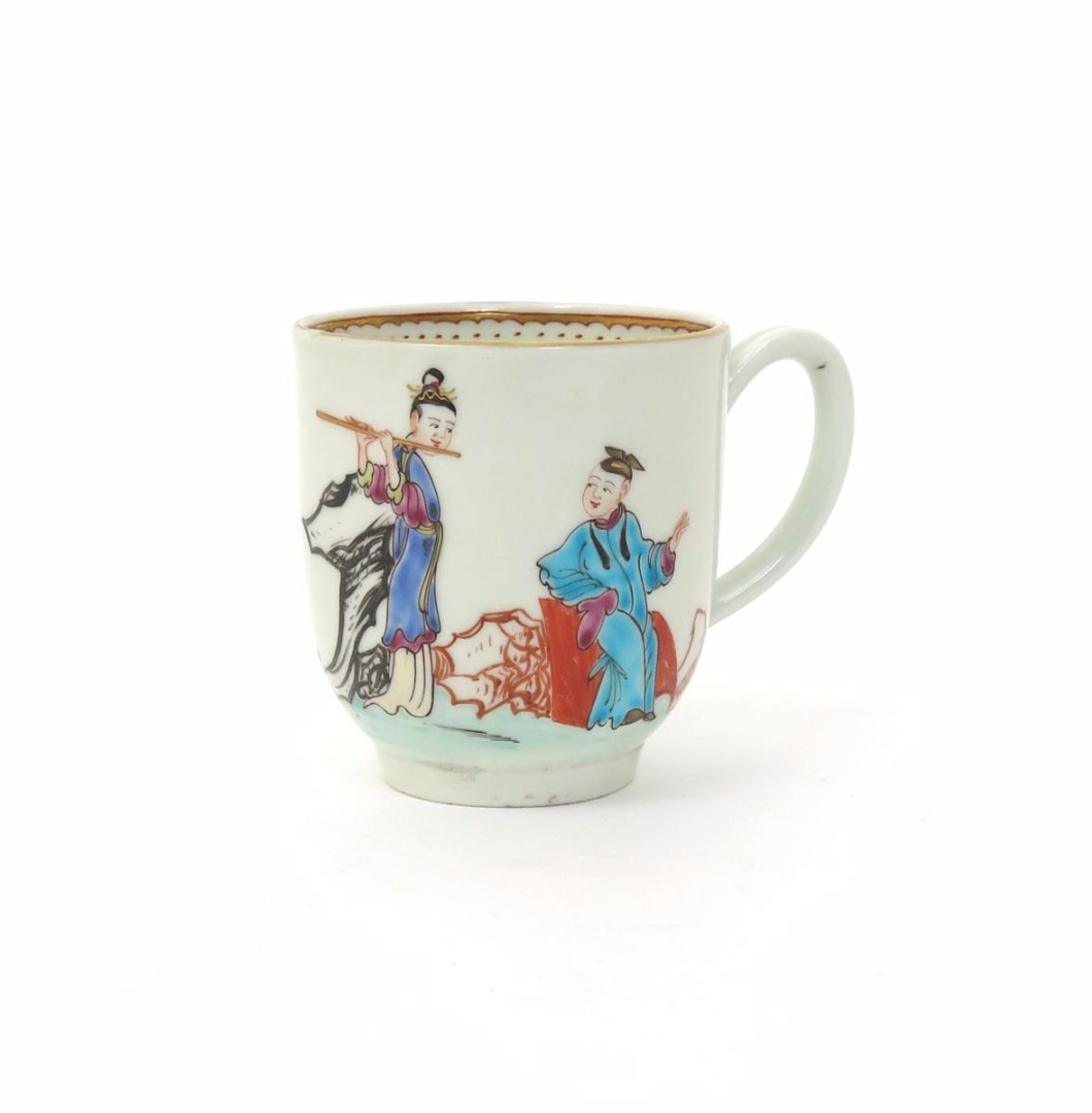 A good Worcester porcelain coffee cup c.1765-75, well painted in bright polychrome enamels with a Chinese lady playing the flute to a further seated figure, a small boy playing with a dog while a moth flies above colourful garden seats, 6cm.