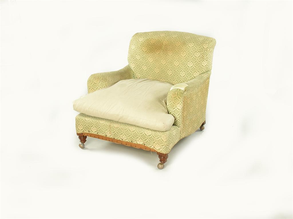 Howard & Sons. A late Victorian easy armchair, with original initialled ticking on turned walnut legs, one back leg stamped '17617, 9695 HOWARD & SONS LTD, BERNER ST', with later shepherd castors.