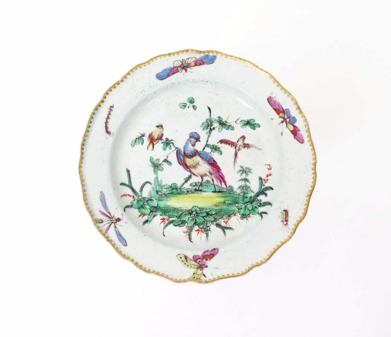 A Bow plate c.1760, painted in polychrome enamels with a dishevelled bird standing on a grassy area with two other birds in flight or perched on a branch behind, the rim with brightly coloured moths, insects and a caterpillar, within a gilt dentil rim, red anchor and dagger mark to the reverse, 20.5cm.
