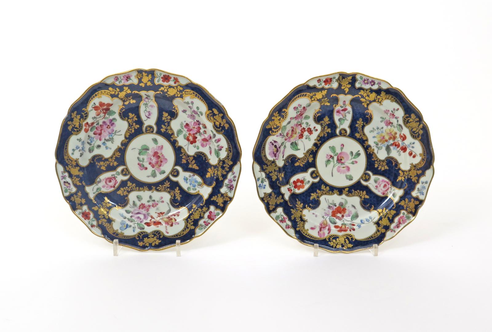 A good pair of Worcester plates c.1770, decorated in the atelier of James Giles with shaped panels of flower garlands edged with further gilt flowers, reserved on a blue scale ground, square seal marks, 22.5cm. (2)