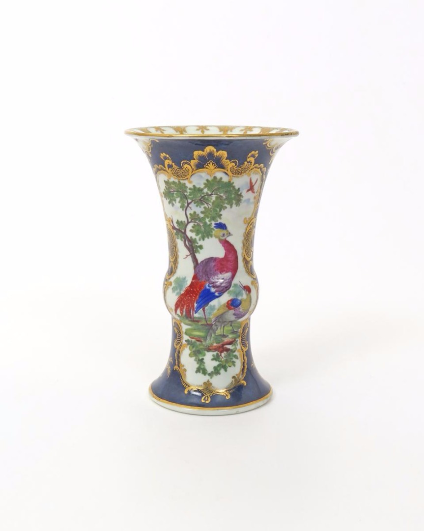A fine Worcester gu-beaker vase c.1770, the flared and lightly knopped form painted with two panels of brightly-coloured fancy birds beneath leafy trees, within gilt cartouches reserved on a blue scale ground, the exterior rim with two further small panels of moths, blue square seal mark, 15.5cm.