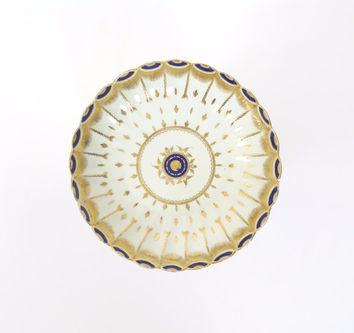 A rare Caughley saucer dish c.1790, with scallop-edged rim, with fine gilt decoration of husks and chains suspended from a fringed and enamelled crescent border, 17.8cm.