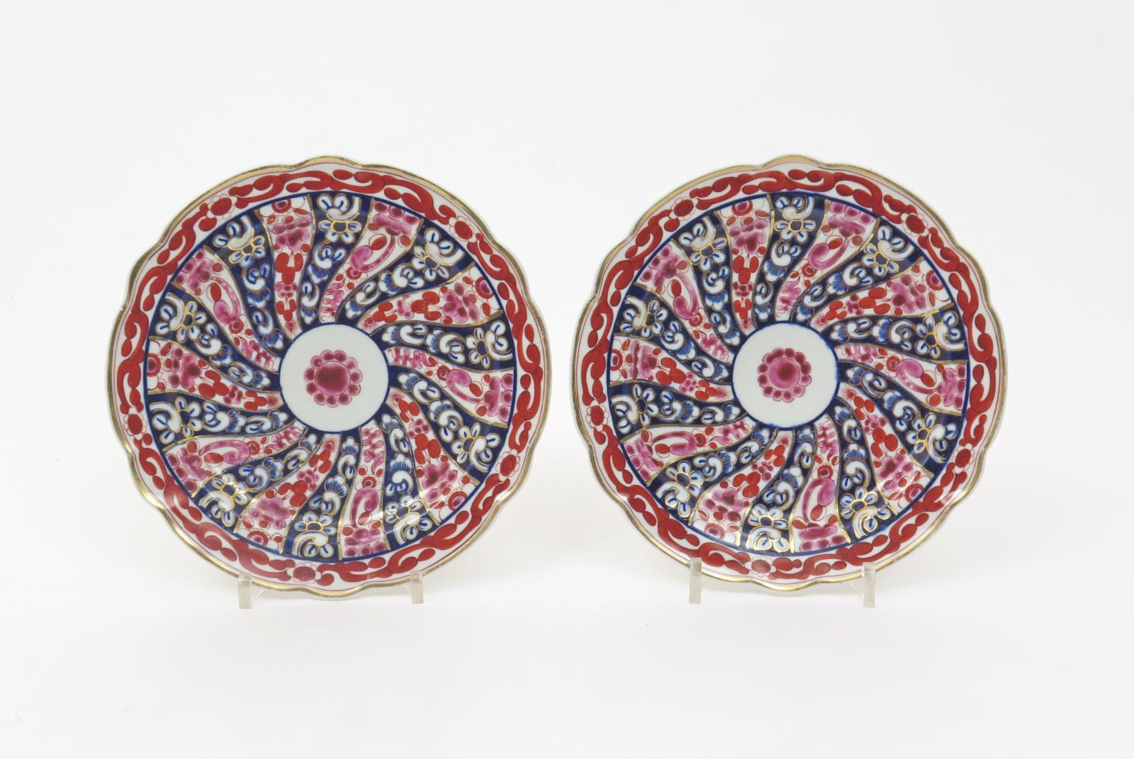 A pair of Barr Worcester dessert plates c.1800, richly decorated in the Queen Charlotte pattern with spiralling stripes of stylized flowers in red, puce, blue and gilt around a central flowerhead, incised B marks, 19.5cm. (2)