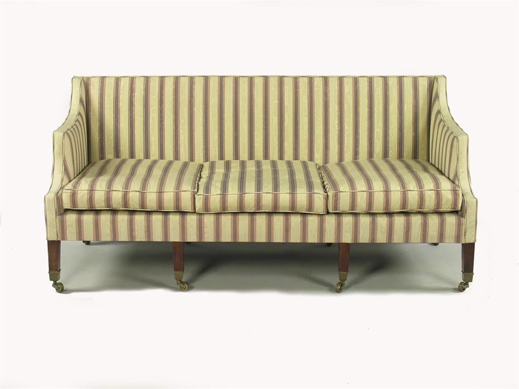 A three seater settee, upholstered in striped watered silk on mahogany legs to brass castors, 34in (86.3cm) h, 22.5in (184cm) w, 30in (76cm) d.