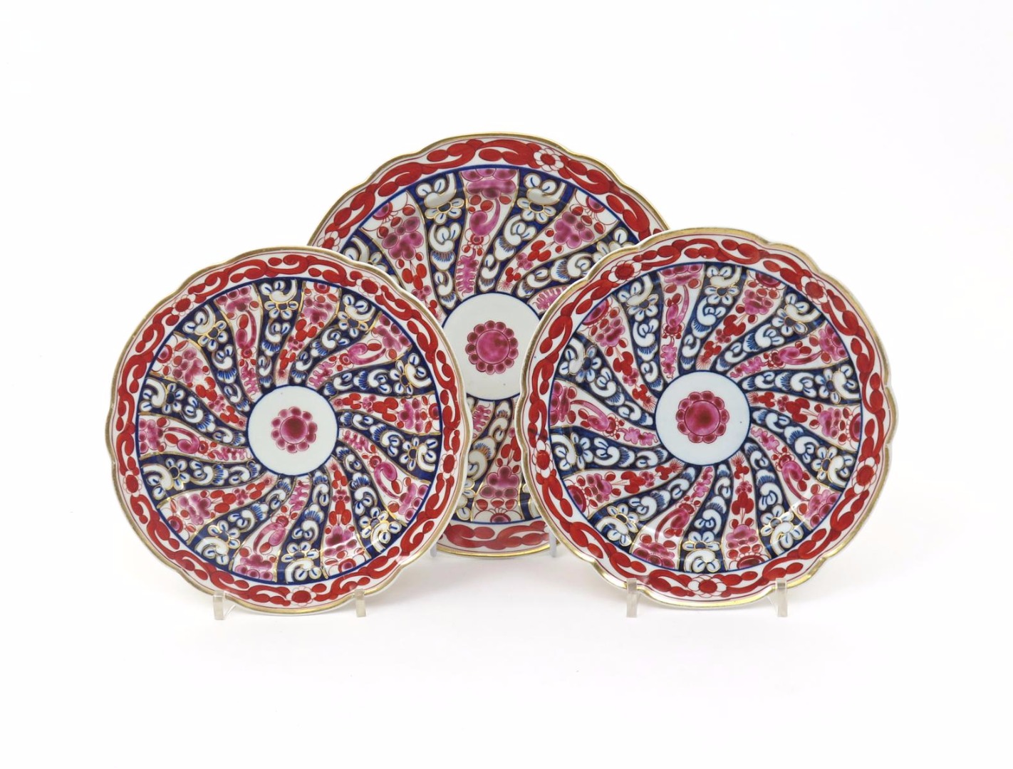 Three Barr Worcester plates c.1800, one large and two small, all decorated with the Queen Charlotte pattern of spiralling stripes in a stylized floral design in imitation of the Imari palette, incised B marks, 24cm max. (3)
