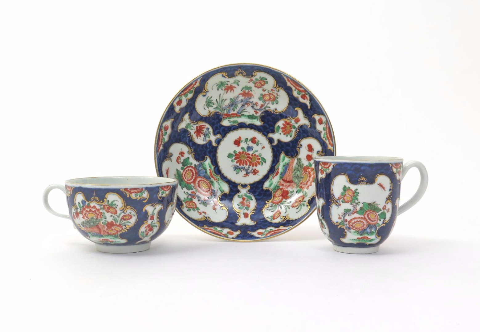 A good Worcester trio c.1770, comprising a teacup, coffee cup and saucer, brightly decorated with panels of Oriental flowers and foliage in the Kakiemon palette, reserved within shaped cartouches on a blue scale ground, square seal marks, 13.6cm. (3)