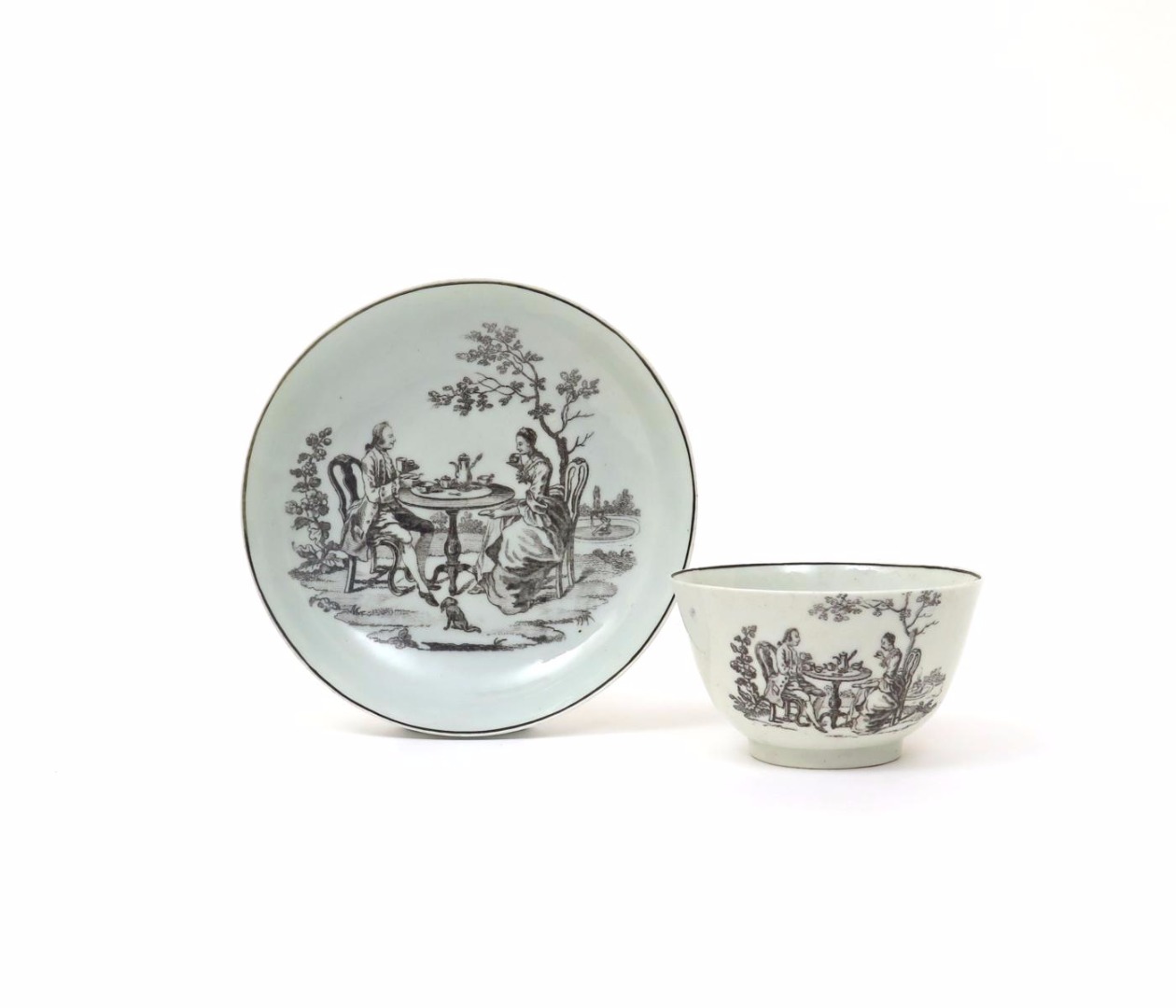 A Worcester teabowl and saucer c.1758-60, printed in black with the Tea Party No. 3 pattern, the reverse of the teabowl with the Maid and Page pattern, 11.8cm. (2)