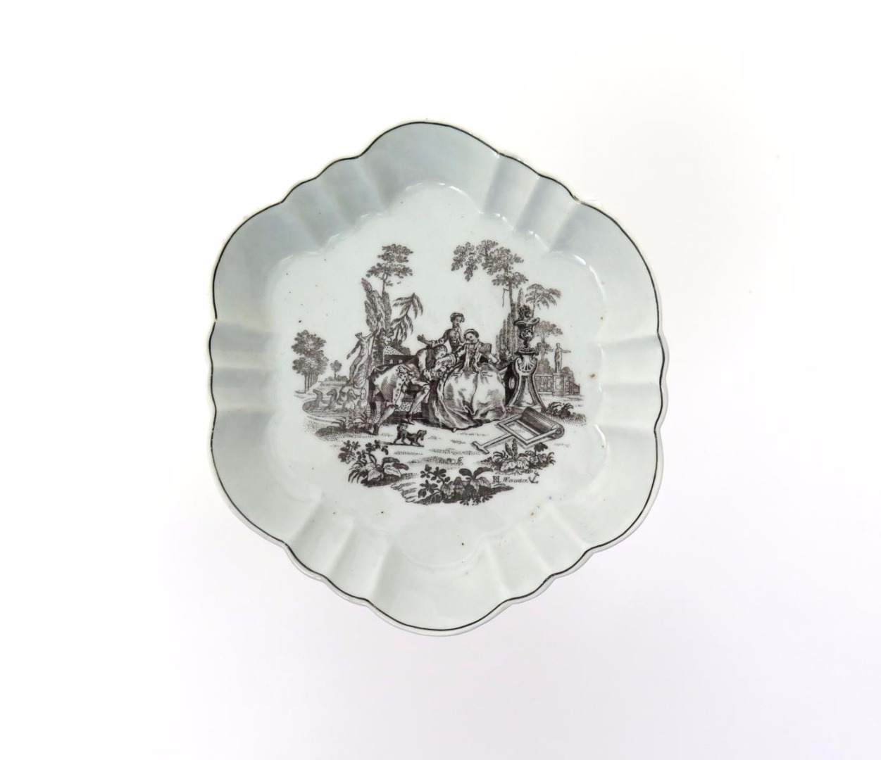 A Worcester hexagonal teapot stand c.1765, printed in black with L'Amour, a courting couple seated on a bench while the lady's maid looks on, 14.5cm.
