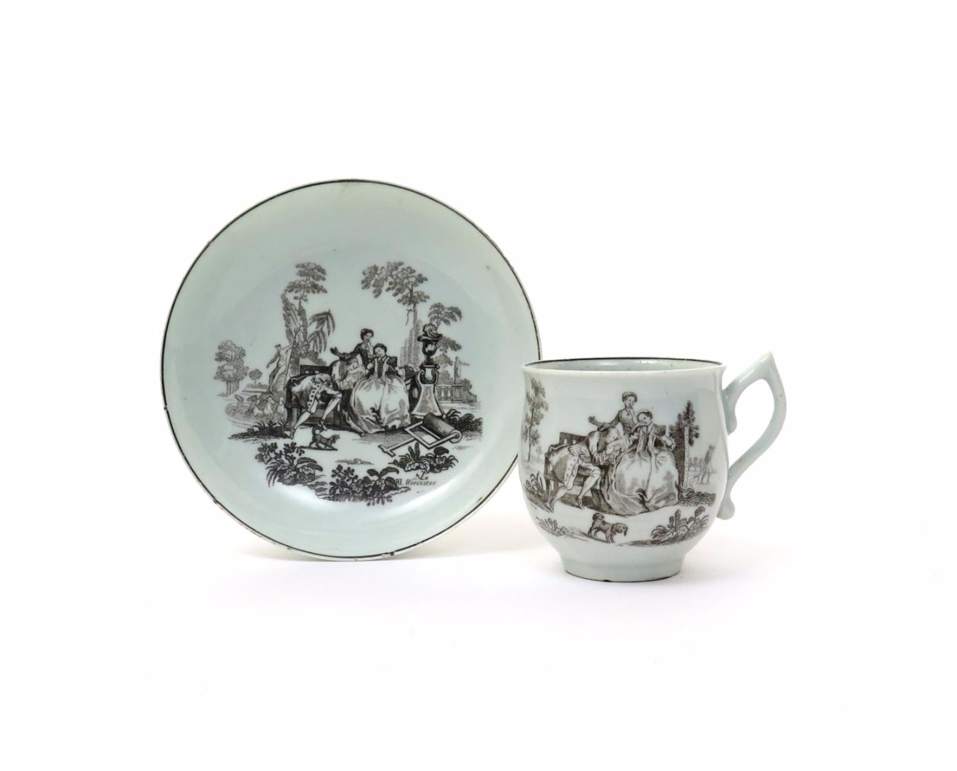 A Worcester printed cup and saucer c.1762, the bell-shaped cup with a wishbone handle, printed in black with L'Amour, the cup's reverse with elaborate garden statuary, 11.5cm.