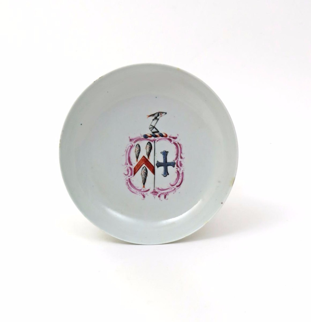 A rare Philip Christian (Liverpool) armorial saucer c.1768-72, painted in polychrome enamels with the arms of Brougham impaling Lamplugh, a chevron with three lucies, and a cross flory surmounted with a crest of a hand and arm in armour holding a further lucie, 15.4cm.