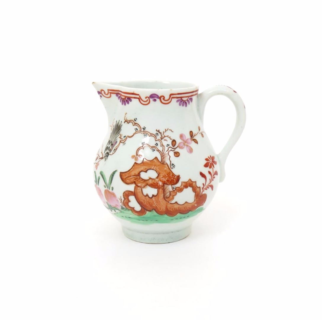 A Lowestoft sparrow beak jug c.1770, painted in the Chinese manner with the Blackbird pattern, a bird perched on a branch issuing from red rockwork, its head pointing down towards two large pink fruits, the rim with a scrolled border in red and purple, 8.5cm.