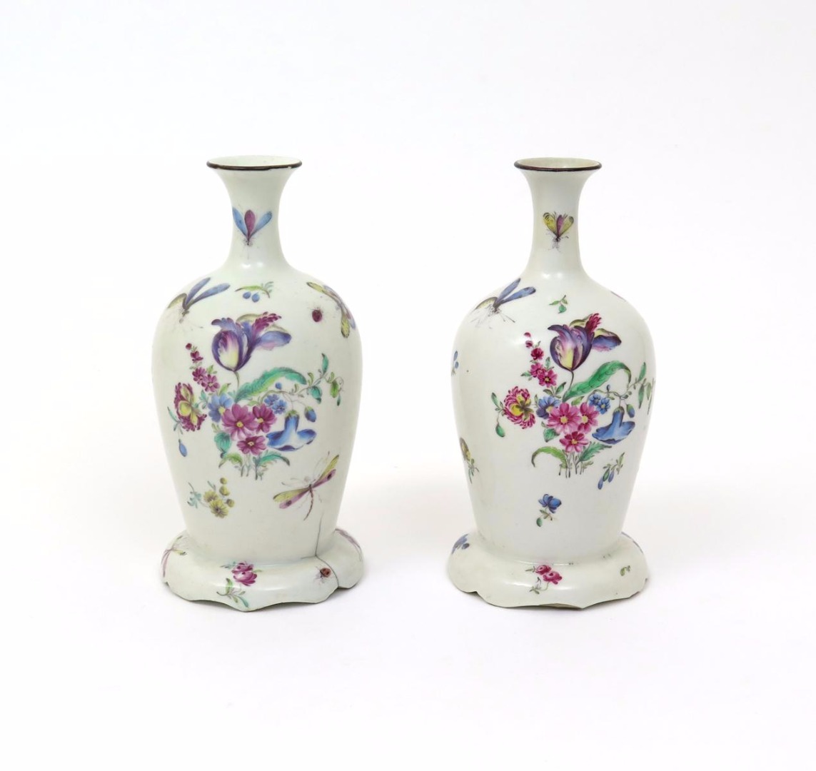 A rare pair of Bow vases c.1760, of ovoid shaped, each raised on a shaped domed foot with a short flared neck, painted in polychrome enamels with bold flower sprays, flying insects and moths, brown line rims to the necks, one with an iron red 4 mark, minor faults, 22cm. (2)