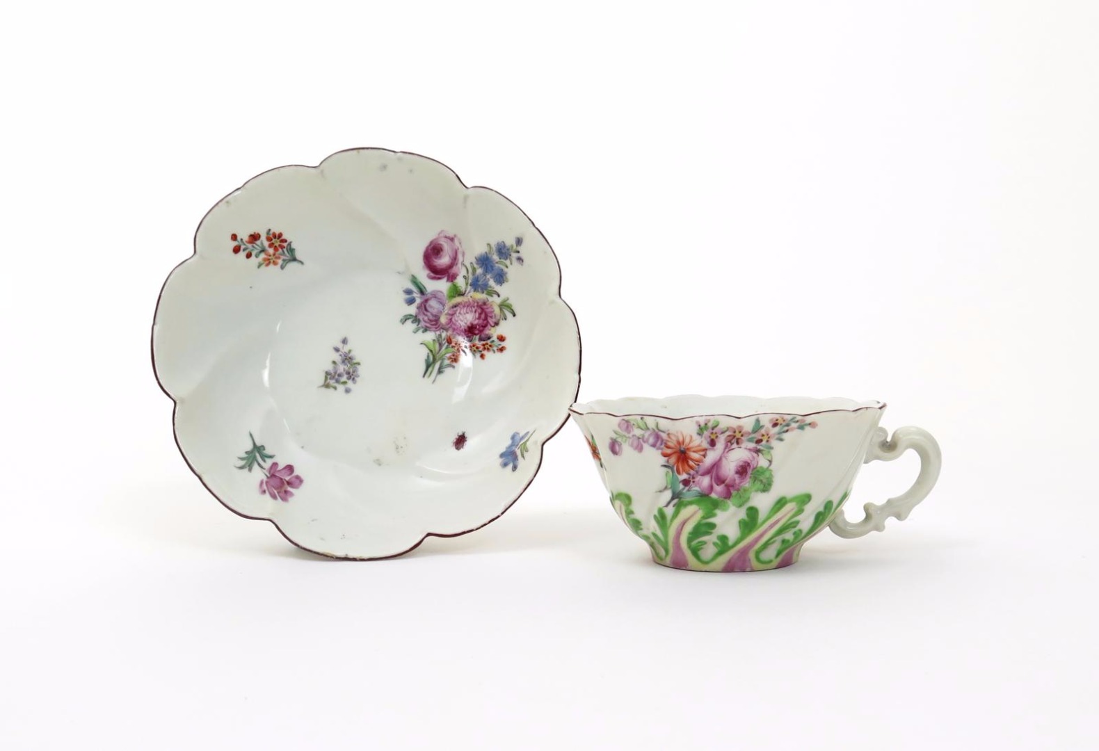 A rare Chelsea teacup and saucer c.1755, of spiral-fluted form, moulded with a band of leaves picked out in green, puce and pale yellow enamels, painted with sprays of English flowers, a small ladybird to the saucer, the cup with a scroll moulded handle, red anchor marks, the handle restored, 12.5cm.