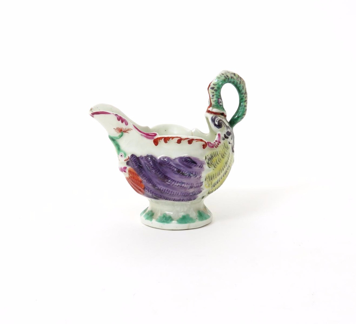 A Worcester dolphin ewer creamboat c.1765-68, of traditional form, moulded beneath the spout with two dolphins with tails entwined, the handle formed as a lamprey, picked out in polychrome enamels, a single blue flower sprig to the inside spout, minor faults, 9.1cm across.