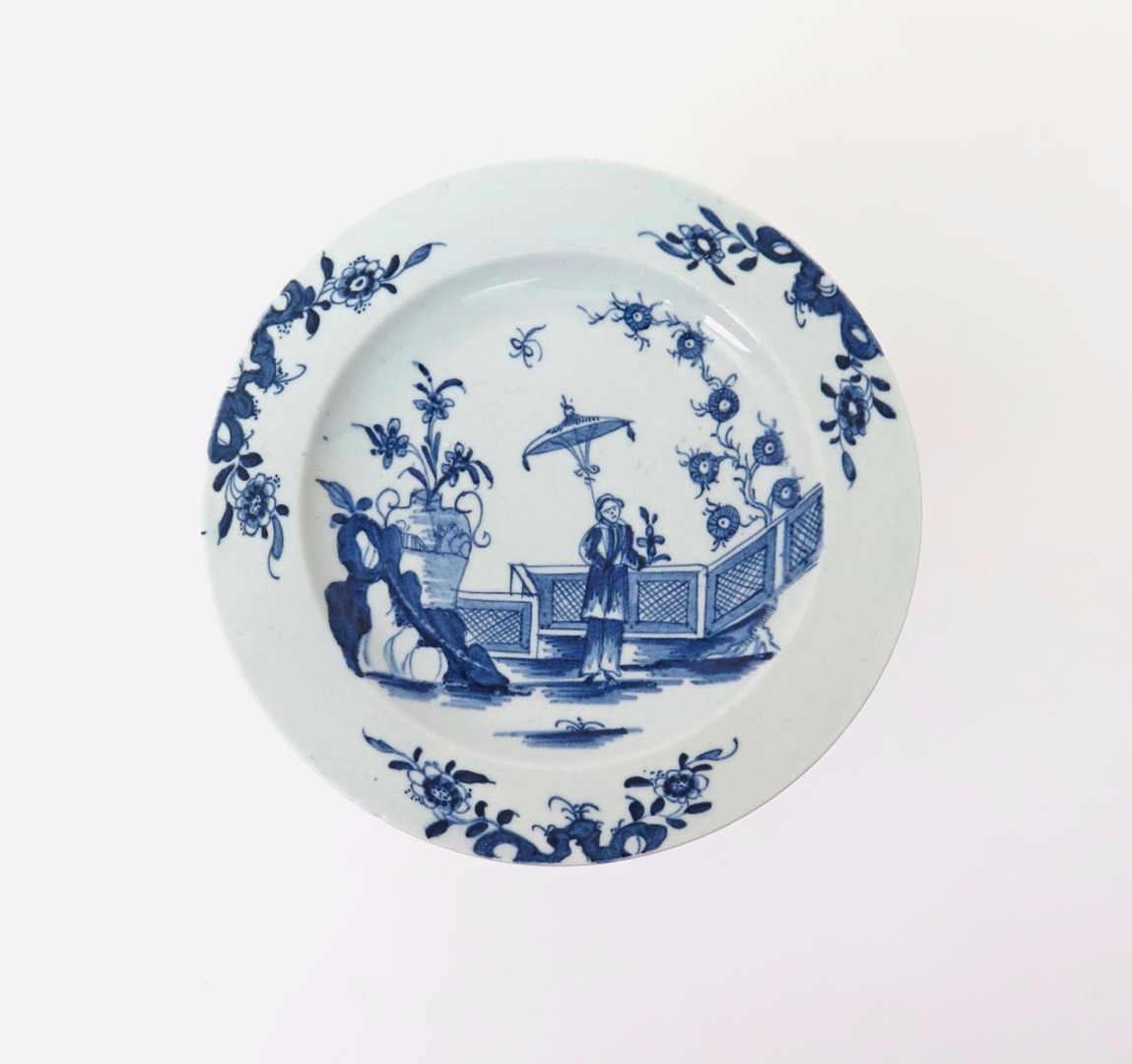A good Lowestoft blue and white plate c.1770, painted with a Chinese lady holding an elaborate open parasol above her head, standing before a zigzag fence, the pattern echoed to the large vase on her right, the rim with three vignettes of prunus issuing from rockwork, 21.8cm.