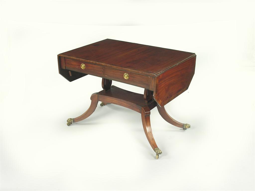A Regency mahogany sofa table, the rosewood banded top inlaid stringing above cedar lined drawers fitted later handles on twin pierced lyre supports to a concave platform, 28.25in (71.8cm) h, 39.5in (100cm) w, closed, 26.75in (68cm) d.