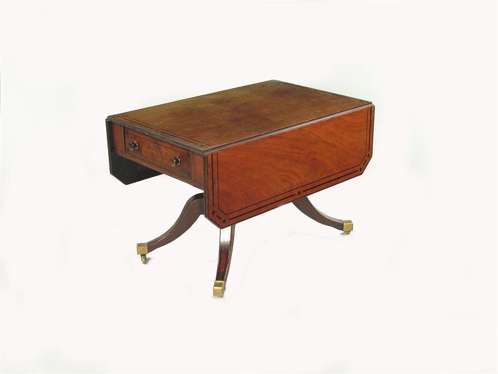 A George IV mahogany drop leaf table, with ebonised dot and line inlay and end frieze drawers fitted later handles, 28.5in (72.3cm), 27.5in (70cm) h, closed, 41.5in (105.4cm) d.