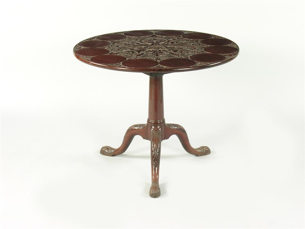 A 19th century carved mahogany supper table, the circular tilt top, revolving on a birdcage to a turned barrel column, 27.5in (70cm) h, 35in (89cm) dia.