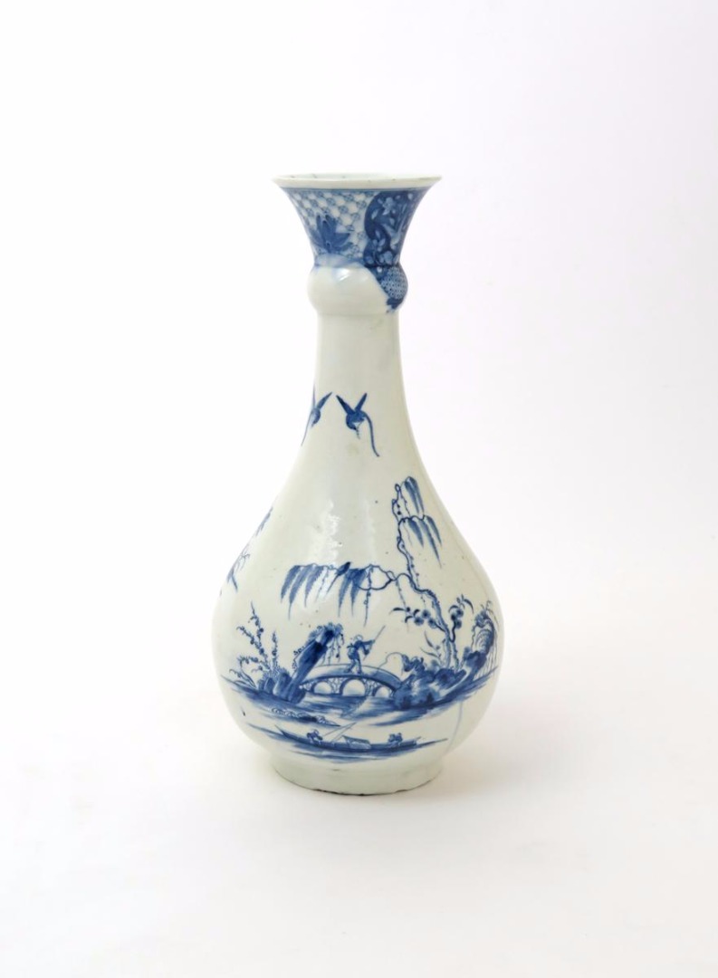 A Worcester blue and white water bottle or guglet c.1760-65, painted with the Willow Bridge Fisherman pattern, a figure traversing an arched bridge with two further figures fishing from a sampan beneath, the reverse with a figure and a bird beside a small pagoda beneath pine, the ovoid body rising to a knopped flared neck, open crescent mark, a short rim crack, 27.8cm.