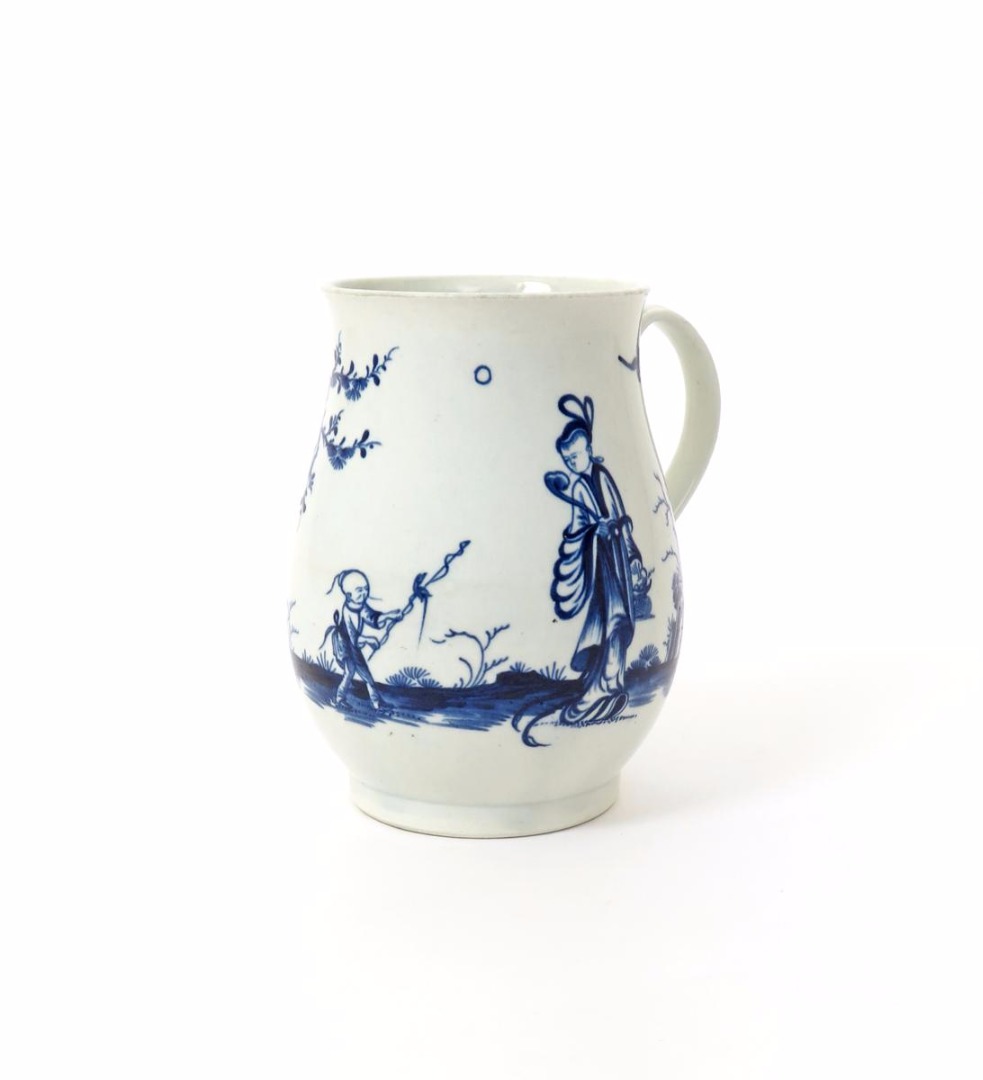 A large Worcester blue and white bell-shaped mug c.1760-65