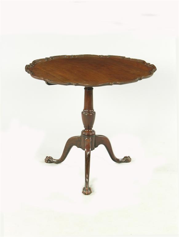 A George III style mahogany tripod table, with a 'pie crust' tilt-top, 28.5in (72.3cm) h, 33in (84cm) dia.