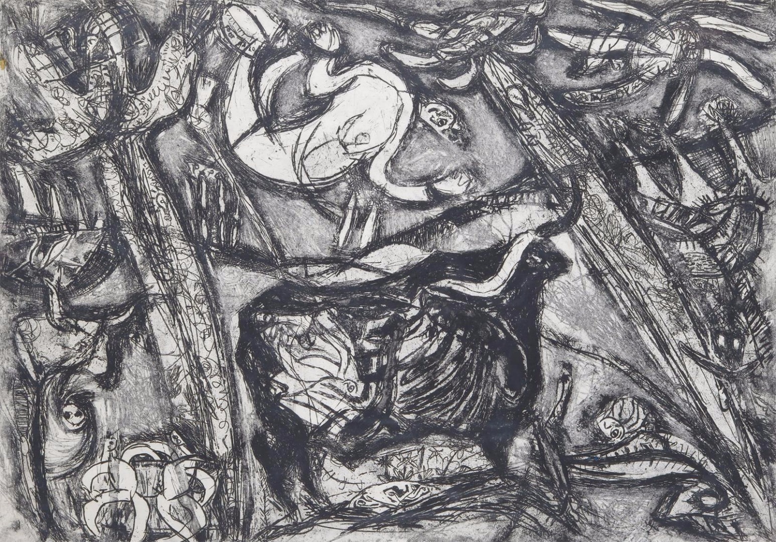 ‡Kate Dineen (20th Century) Buffalo composition Etching 38.5 x 54.5cm; 15 x 21¼in