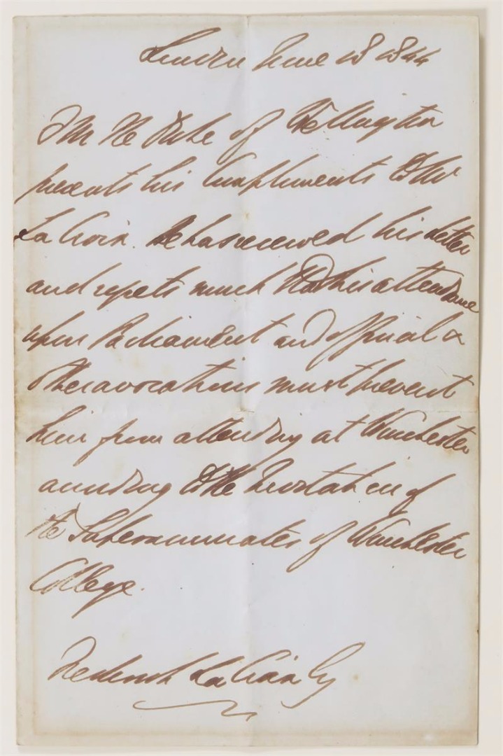 Arthur Wellesley, First Duke of Wellington. Letter to Frederick da Goia Esq. from Wellington with regrets that he cannot attend a day at Winchester College, with envelope with seal stamped 18 June 1844
