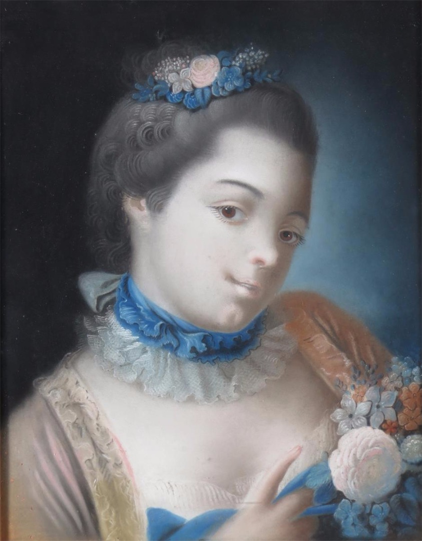 French School late 18th Century A young lady holding a bouquet Pastel 41 x 31cm; 16 x 12in