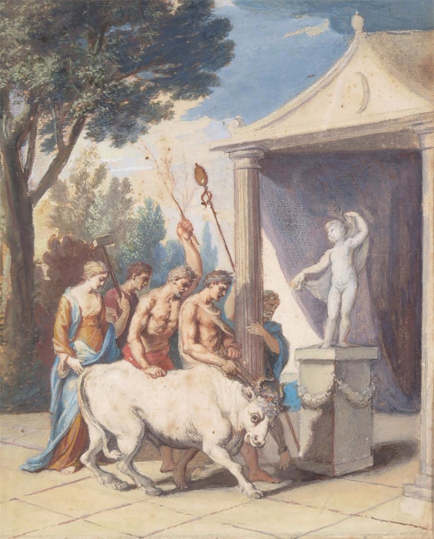 Attributed to Elisabeth Sophie Cheron (French 1648-1711) A Classical sacrifice Watercolour and...