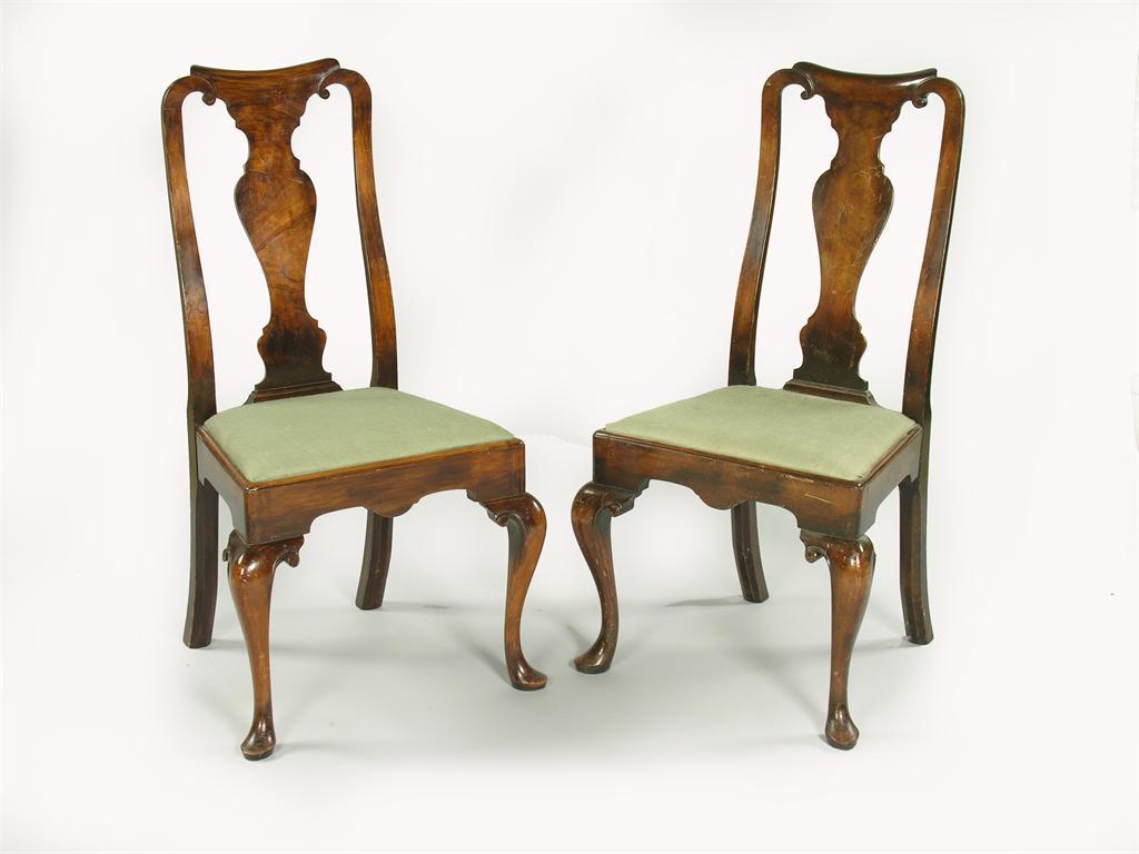 A set of six walnut George I style side chairs, with simulated decoration and drop-in seats. (6) Provenance: Formerly at Fonthill House, Nr. Tisbury, Wiltshire.
