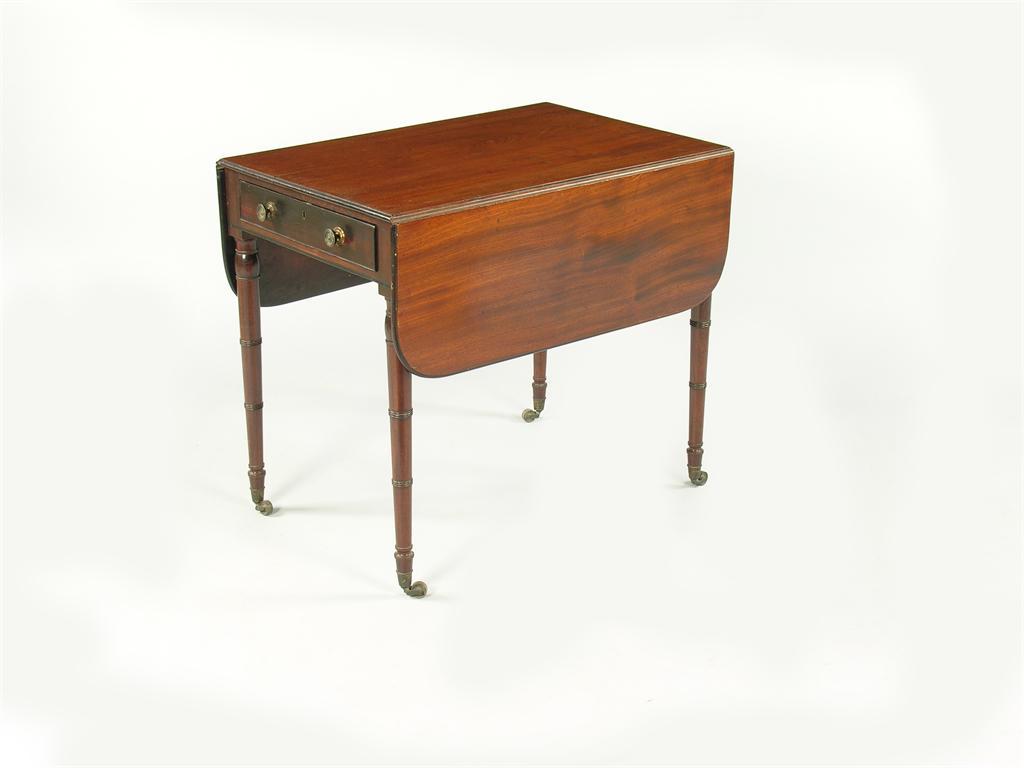 An early 19th century mahogany Pembroke table, the ebonised moulded edge top above ebonised stringing to the frieze on part ebonised legs, 28.5in (72.5cm) h, 22in (56cm) w, closed, 32.75in (83cm) d.