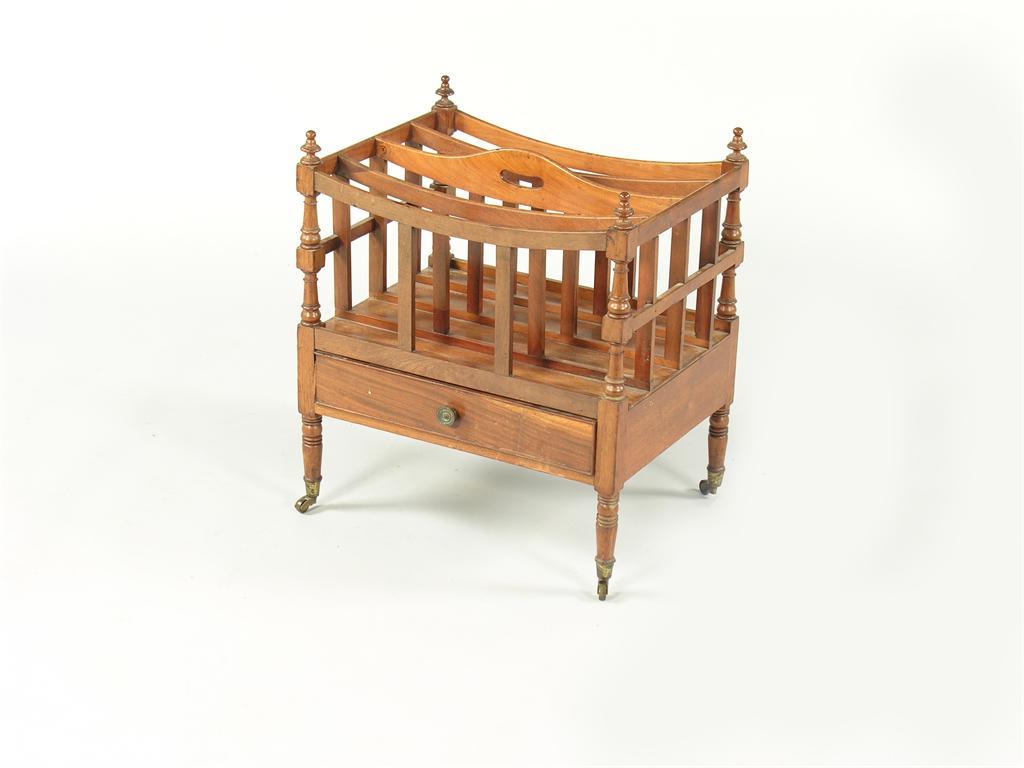 A 19th century mahogany Canterbury, with dipped divisions and a central pierced hand grip, the frieze drawer fitted a later brass handle, 20.75in (53cm) h, 18.5in (47cm) w, 14in (35.5cm) d.