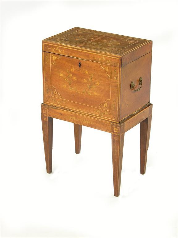 An early 19th century mahogany cellaret, with later marquetry inlay, the fixed stand with spliced legs, 26.5in (67.3cm) h, 16.75in (42.5cm) w, 11.5in (29cm) d.